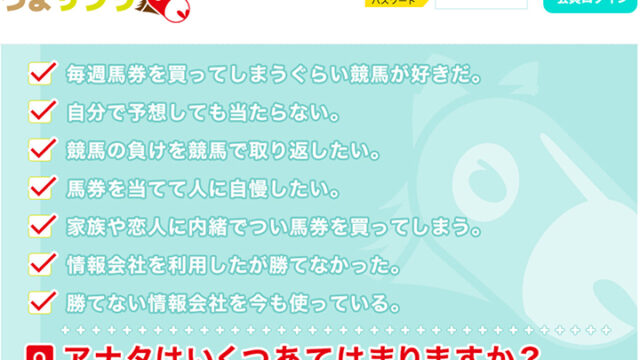 ×未検証競馬サイトうまサプリ 【うまサプリの概要】毎週馬券を買ってしまうぐらい競馬が好きだ。自分で予想しても当たらない。競馬の負けを競馬で取り返したい。馬券を当てて人に自慢したい。家族や恋人に内緒でつい馬券を買ってしまう。情報会社を利用したが勝てなかった。勝てない情報会...2022.06.21×未検証競馬サイト